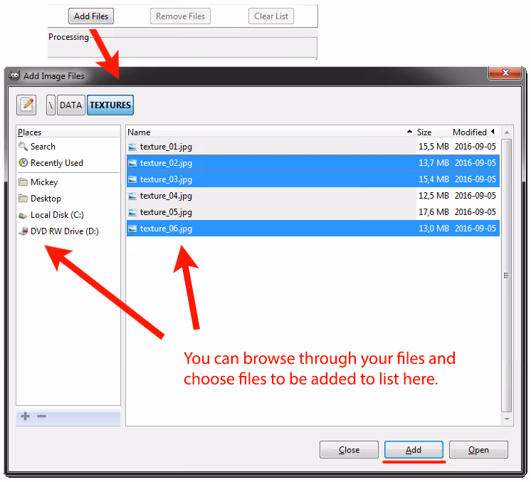 - Add Files option will open a window where you can browse and add files to the list of processed images. You can use Ctrl and Shift keys in conjunction with mouse clicks to select multiple images to be added to the list.