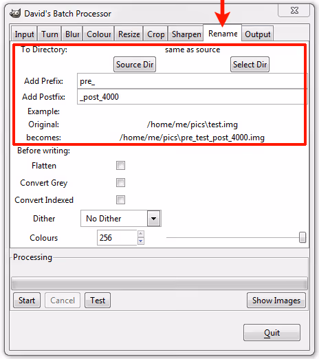 - Rename – These options let you batch rename processed images.The processor will not overwrite an existing file. The output file must be renamed, have its extension changed, or be put into a different directory.
