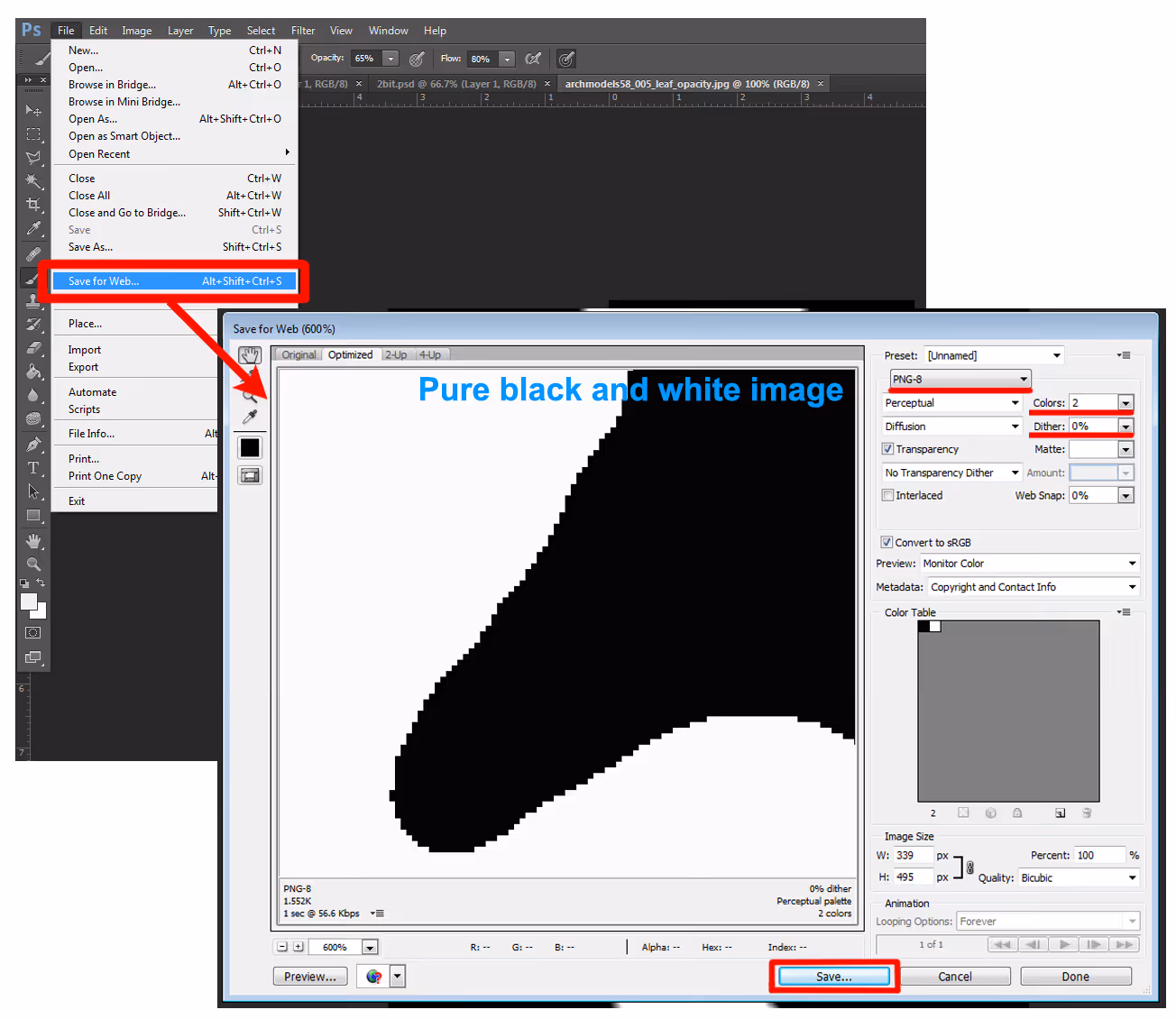 - Set number of colors to 2, and Dither to 0%