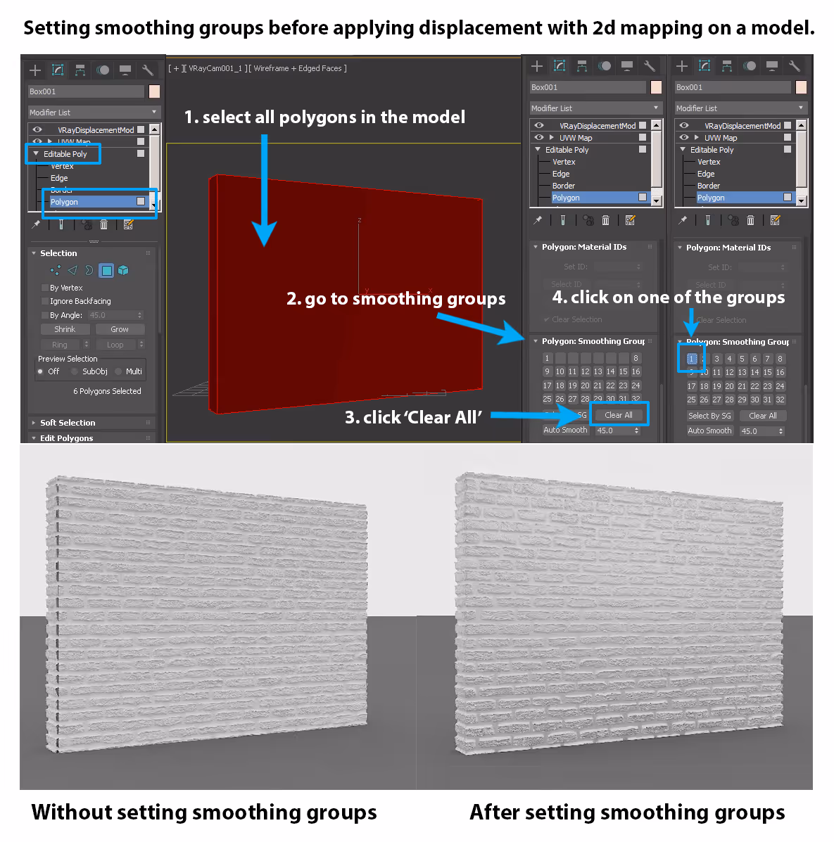 The polys which are set to the same smoothing group will keep the continuity, especially if you will match the displacement map so that the same parts of it meet at the corners. Sometimes adding a bevel to the corners helps. This can be done via the 3ds Max ‘bevel’ option for Editable Poly, or Turbosmooth added to the Editable Poly model with a properly prepared mesh.