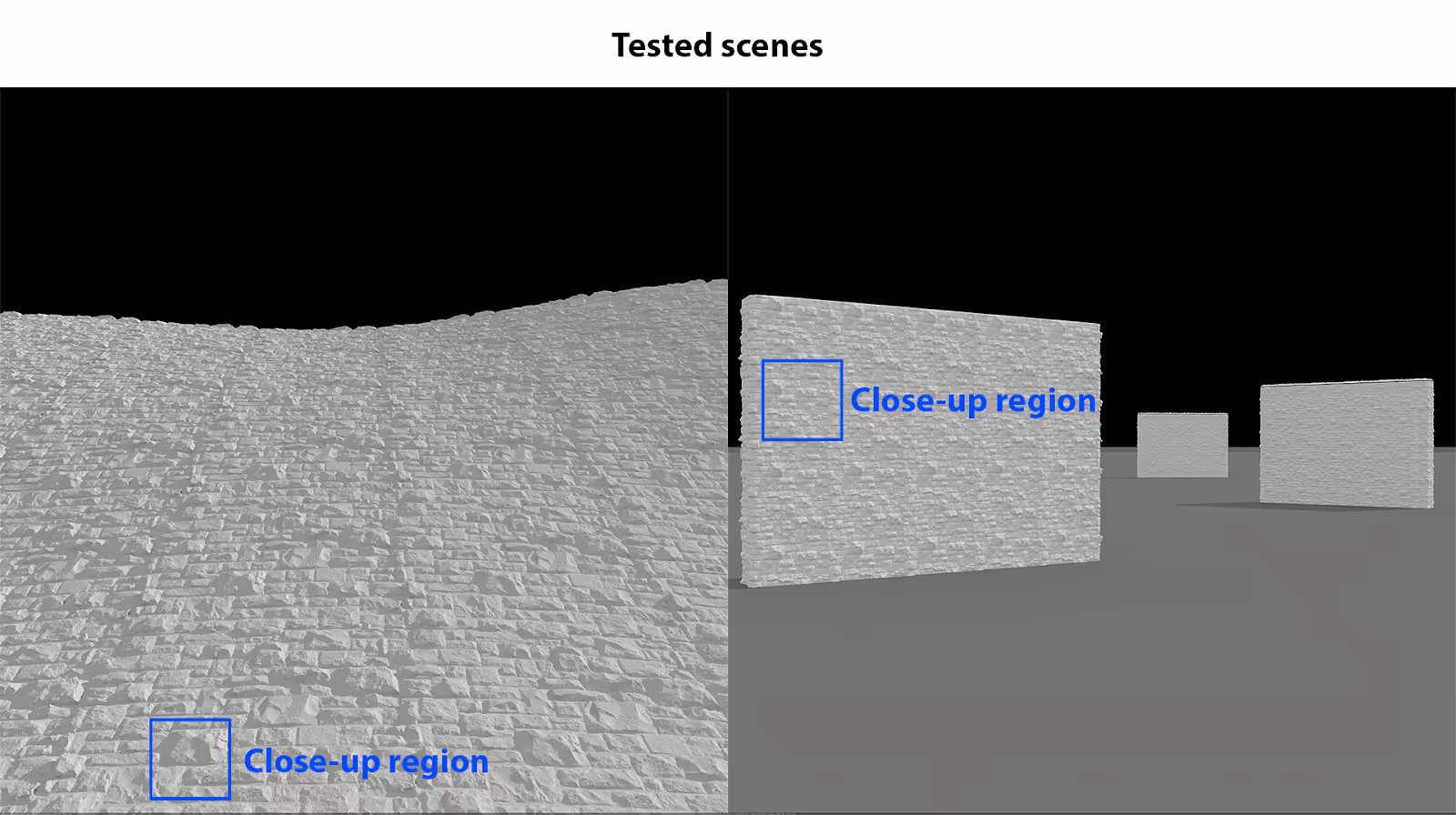 Then for comparison, we will render the scenes with 3D mapping (View-dependent) set up to use the same amount of RAM as the scene rendered with 2D displacement mode, and compare the quality and render times.