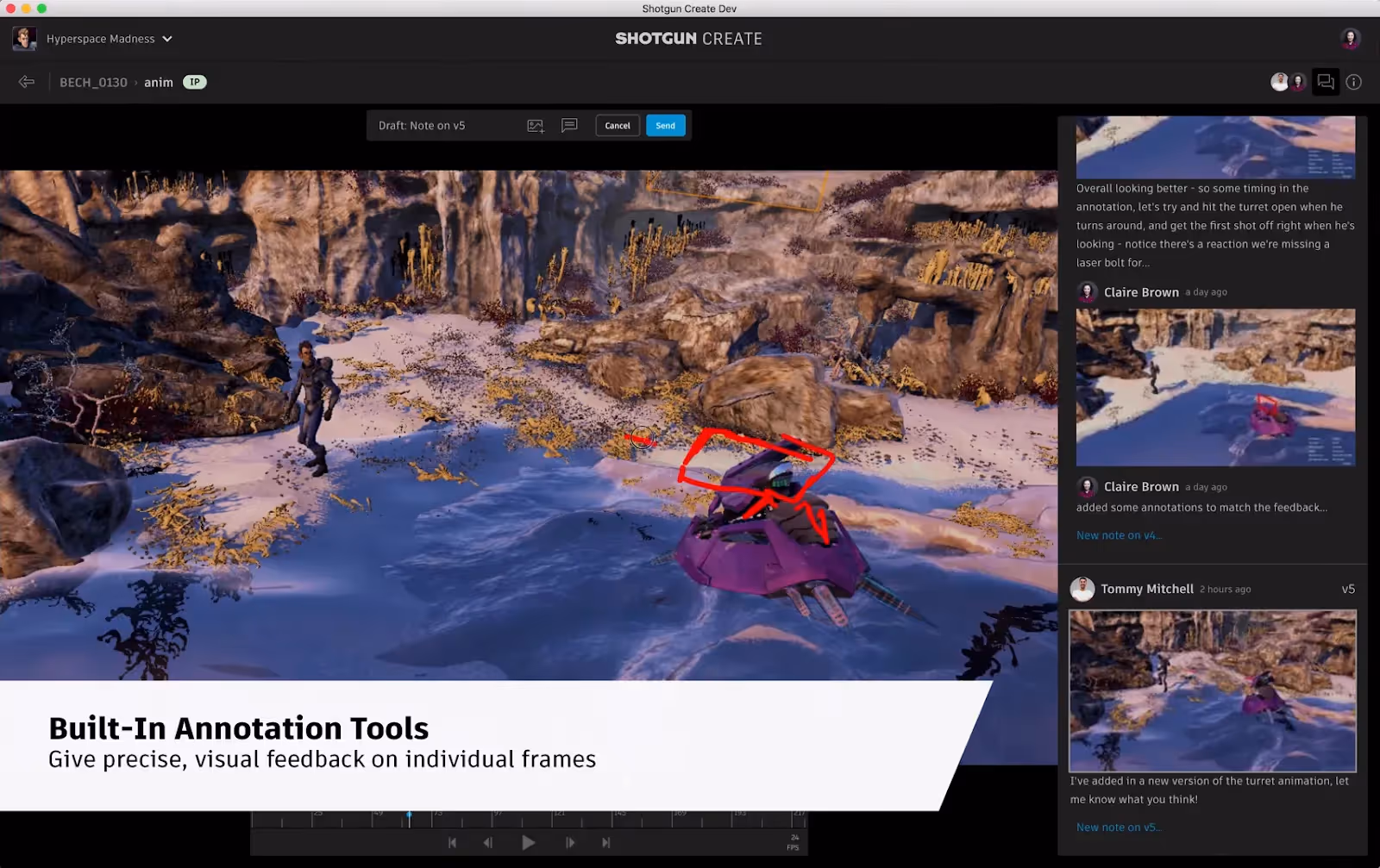Described by the producer as being like Facebook for production, its tools include a wall for each shot where people can post new versions, annotations you can scribble directly onto the video clips, and a complete history of all notes are automatically kept in case they need to be referred back to in future. Shotgun’s features were especially useful when shots were passed from one artist to another. A strong discipline in how Shotgun was necessary to keep things running as smoothly as reasonably possible.