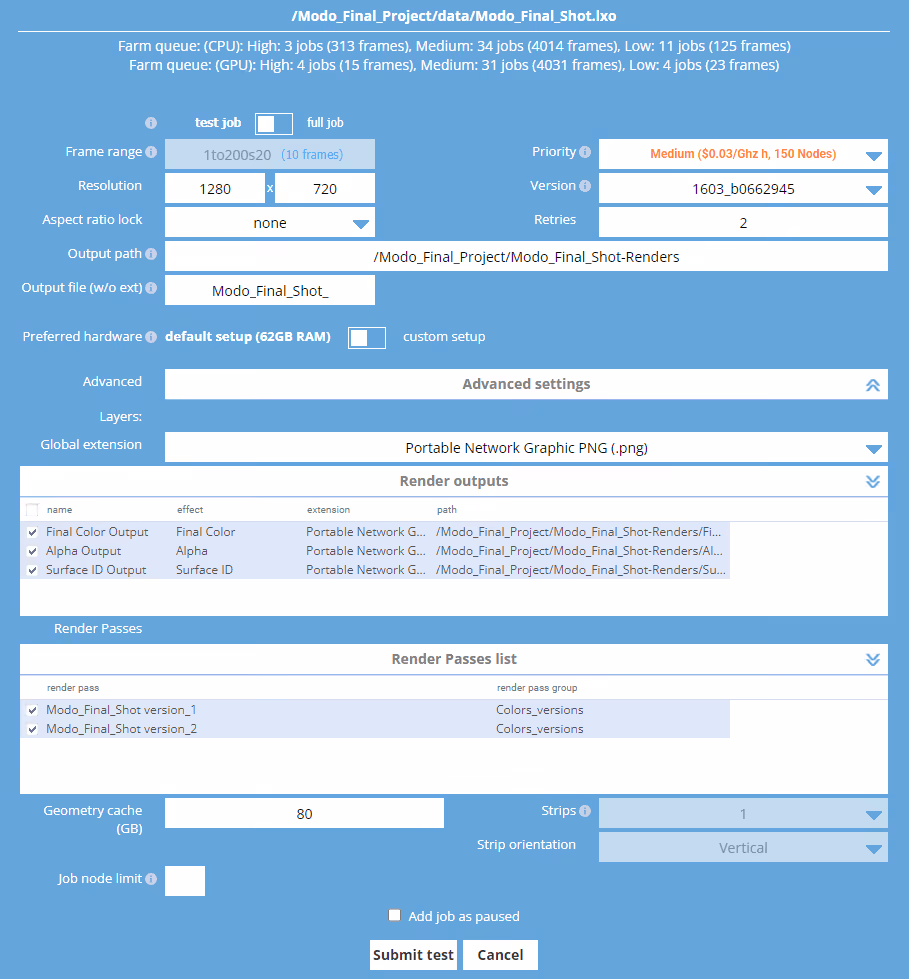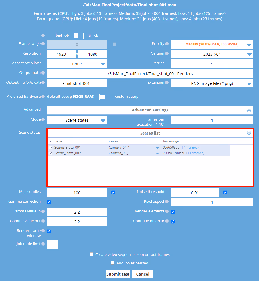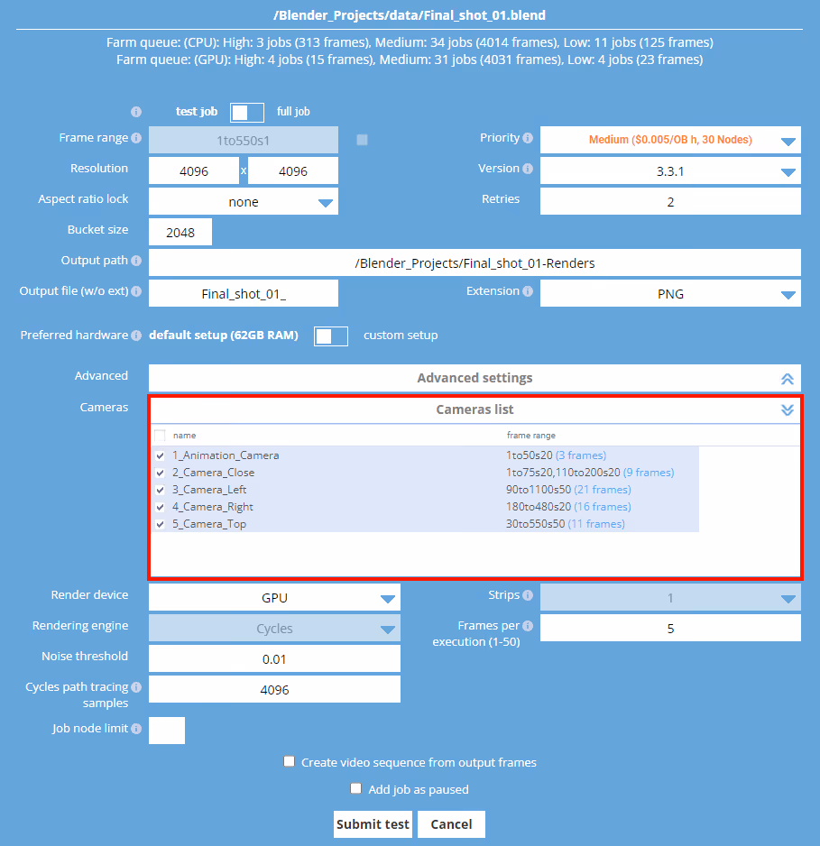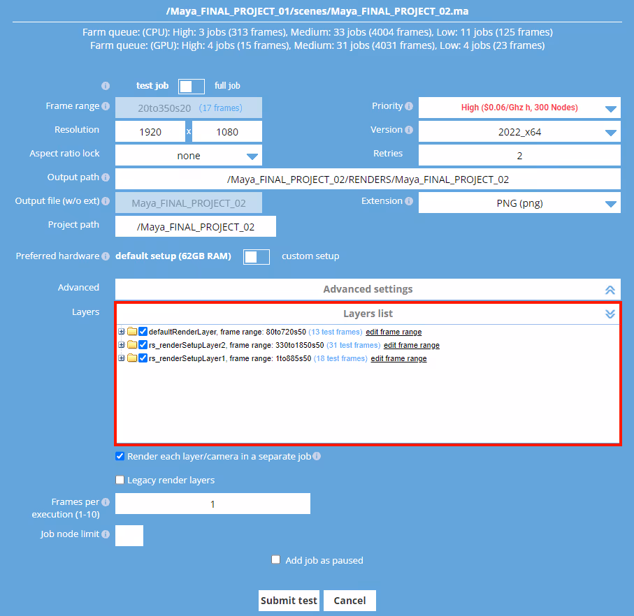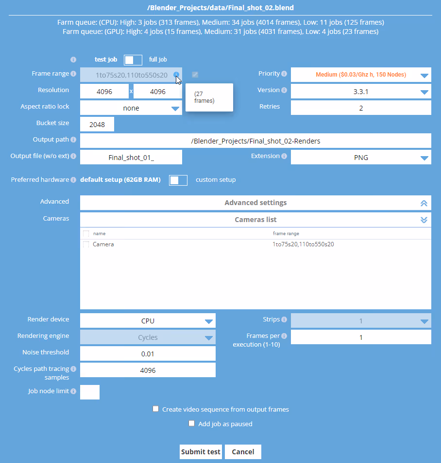 例:1~500の範囲をレンダリングしたい場合、システムは自動的に「テストジョブ」の範囲を1to500s20に設定します。これは、25フレームがレンダリングされることを意味します。より少ないフレームをレンダリングしたい場合は、ステップパラメーターをより大きな値に自分で設定する必要があります。つまり、1to500s50に設定すると、10フレームのみレンダリングされます。また、ステップパラメータを1to500s10のように小さい値に設定すると、この場合はテストとして50フレームをレンダリングできるようになります。