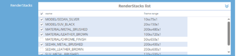"RenderStacks" 모드와 패스 목록은 3ds Max 플러그인을 통해 씬을 제출할 때 renderStacks 플러그인이 활성화된 경우에만 웹매니저에 표시됩니다. renderStacks 플러그인을 사용하여 씬을 준비했지만 "RenderStacks" 모드나 패스가 표시되지 않는 경우, 지원팀에 문의하여 도움을 받으십시오.