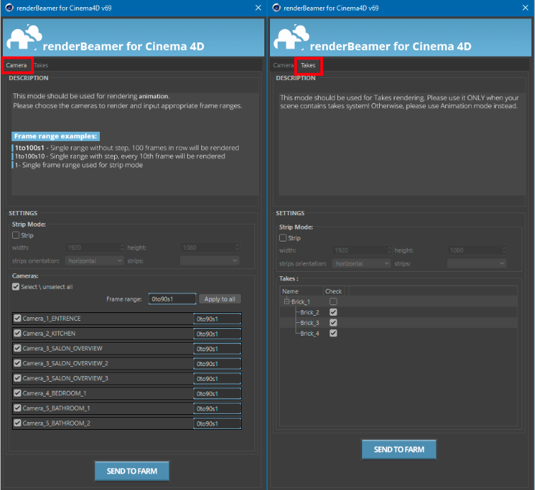 Depending on your scene setup, the plugin UI will start with the Camera or Takes tab. That means, if your scene does not contain any of the takes system, the Takes tab will stay hidden, and the only option available will be the Camera mode. If your project contains any usage of takes - the plugin UI will start in the secondary Takes tab. Please note that if you are using the takes system, you should not render a scene from camera mode and vice versa!
