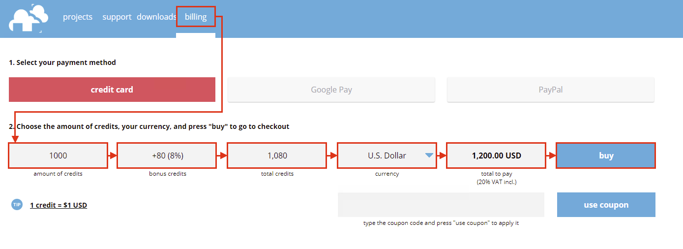 You’ll need to charge your account to continue using the service when you use up all your trial credits. Please note that when your balance goes below $0, you won’t be able to download rendered frames or start new render jobs. You can make payments in the Billing panel in Web Manager. We accept debit cards, credit cards, and wire transfer payments. Also, you can purchase credits via Revolut, Zen, P24.