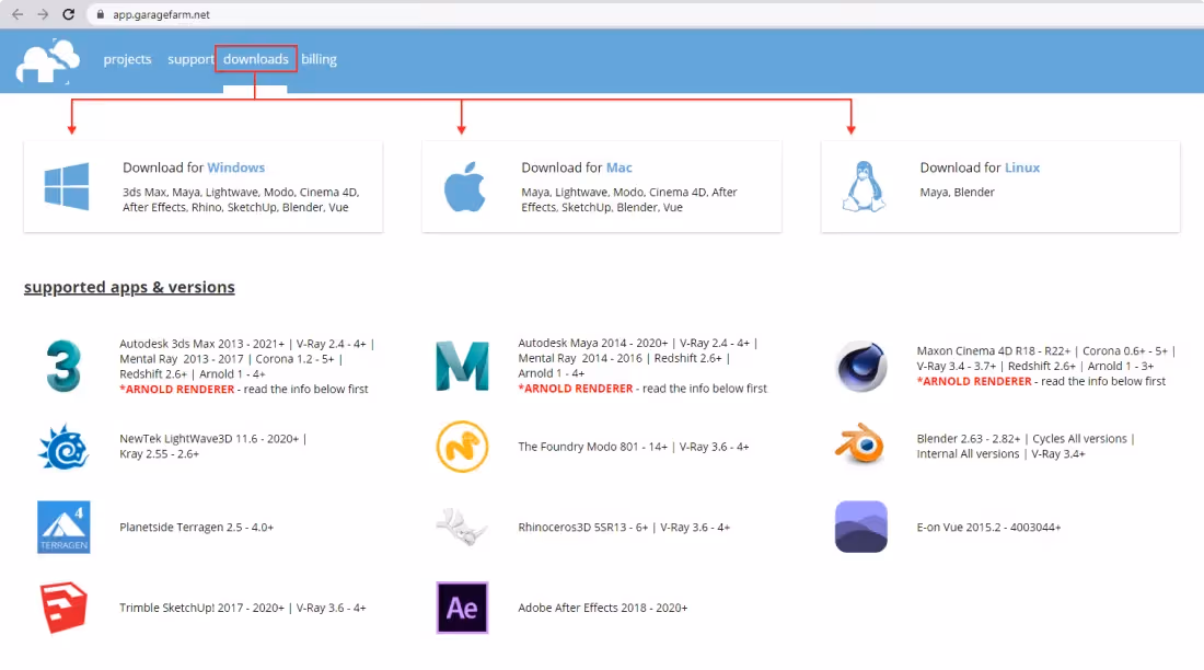 Log in to Web Manager (our web dashboard) at https://app.garagefarm.net/ and download our renderBeamer app. The download link can be found in the Downloads panel located on the top of the dashboard. Supported apps include Blender, Cinema 4D, LightWave, 3ds Max, Maya, Modo, Rhino, SketchUp, Redshift, Terragen, and VUE Xstream.