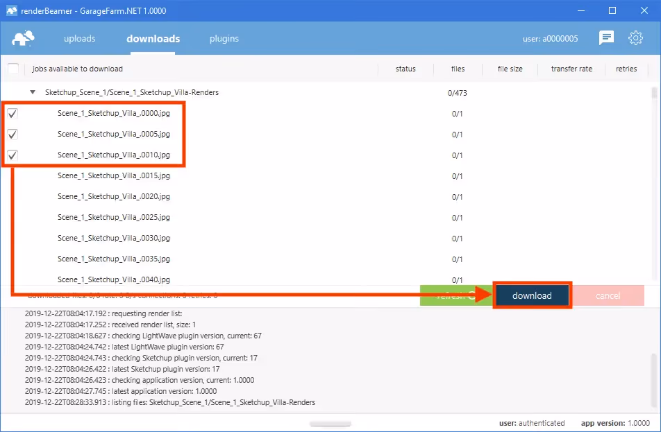 If you prefer more control over what to download and when, you can also download your frames manually. To do that, just turn off auto download switch in renderBeamer settings and go to the “downloads” tab. Next, select the desired render output using a checkbox, and click the download button.