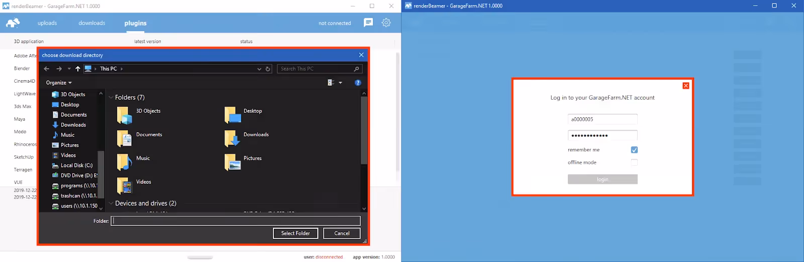 Install the renderBeamer app and start it. Once renderBeamer is done with the installation process, you need to choose the default download directory. This path will be used as the main output place for all your renders. Next, just log in using the account ID you received or your account email. Please keep in mind that the app should always be running in the background whenever uploading a project or downloading rendered frames.