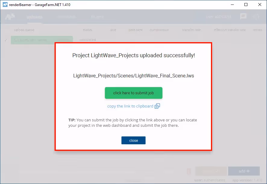 After the scene has been fully uploaded, the app will show you a window with a direct link to your scene on Web Manager (web dashboard). To continue just use click here to submit job button. If for some reason you closed the window with the link or it didn’t work, don’t worry, you can locate your project in the web dashboard and submit your scene by clicking on the scene file later (more on that in the next step). You can also copy link to clipboard and manually paste it into your web browser.