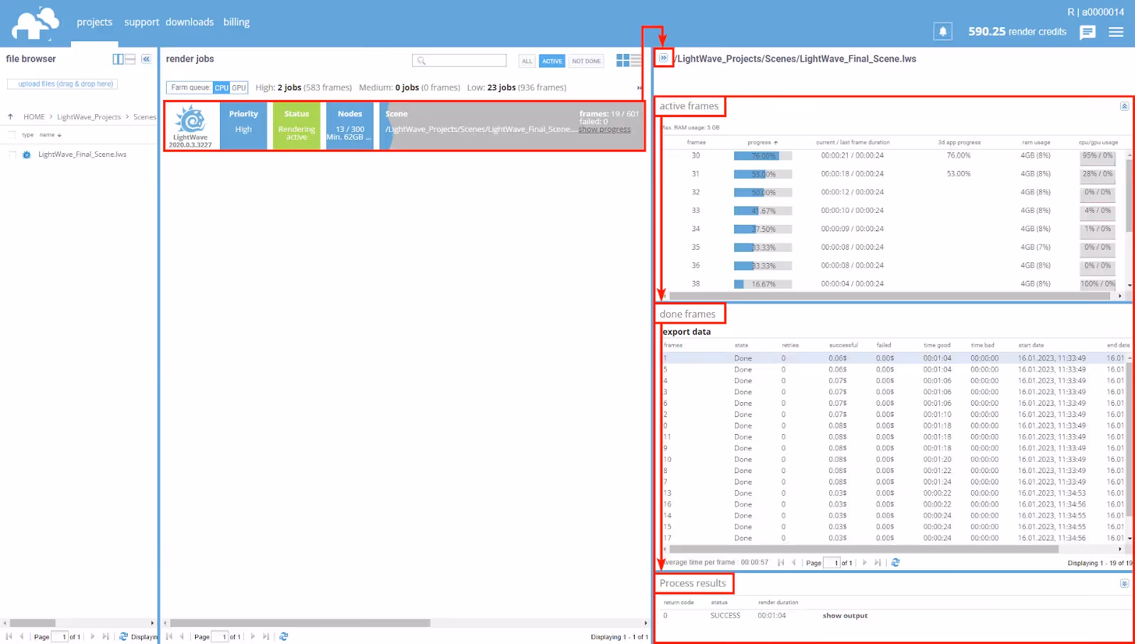 Active frames - it shows currently rendering frames. When a frame finishes, it is moved to the second section Done frames. If you select any frame in the Done frames list, you can then access the render output process log in the bottom section called Process results.
