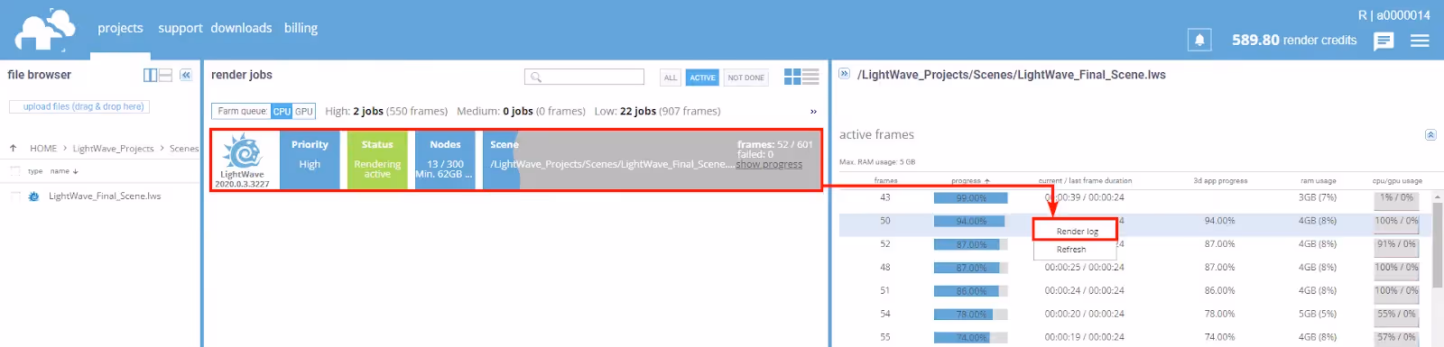 Please keep in mind that if a job has finished rendering, the frames list in the “Active frames” section will be empty because all frames are already rendered and the list is moved to “Done frames”.