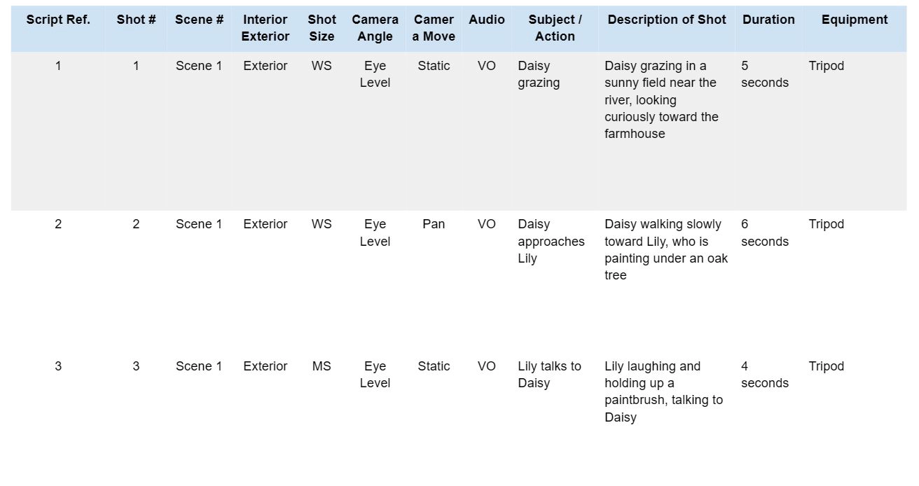 스토리보드는 각 장면을 시각화하여 촬영 감독과 프로덕션 디자이너를 안내합니다. 스토리보드는 프레이밍, 조명, 카메라 앵글에 대한 체크리스트 역할을 하여 모든 사람이 각 장면이 어떻게 실행될지 이해할 수 있도록 합니다.