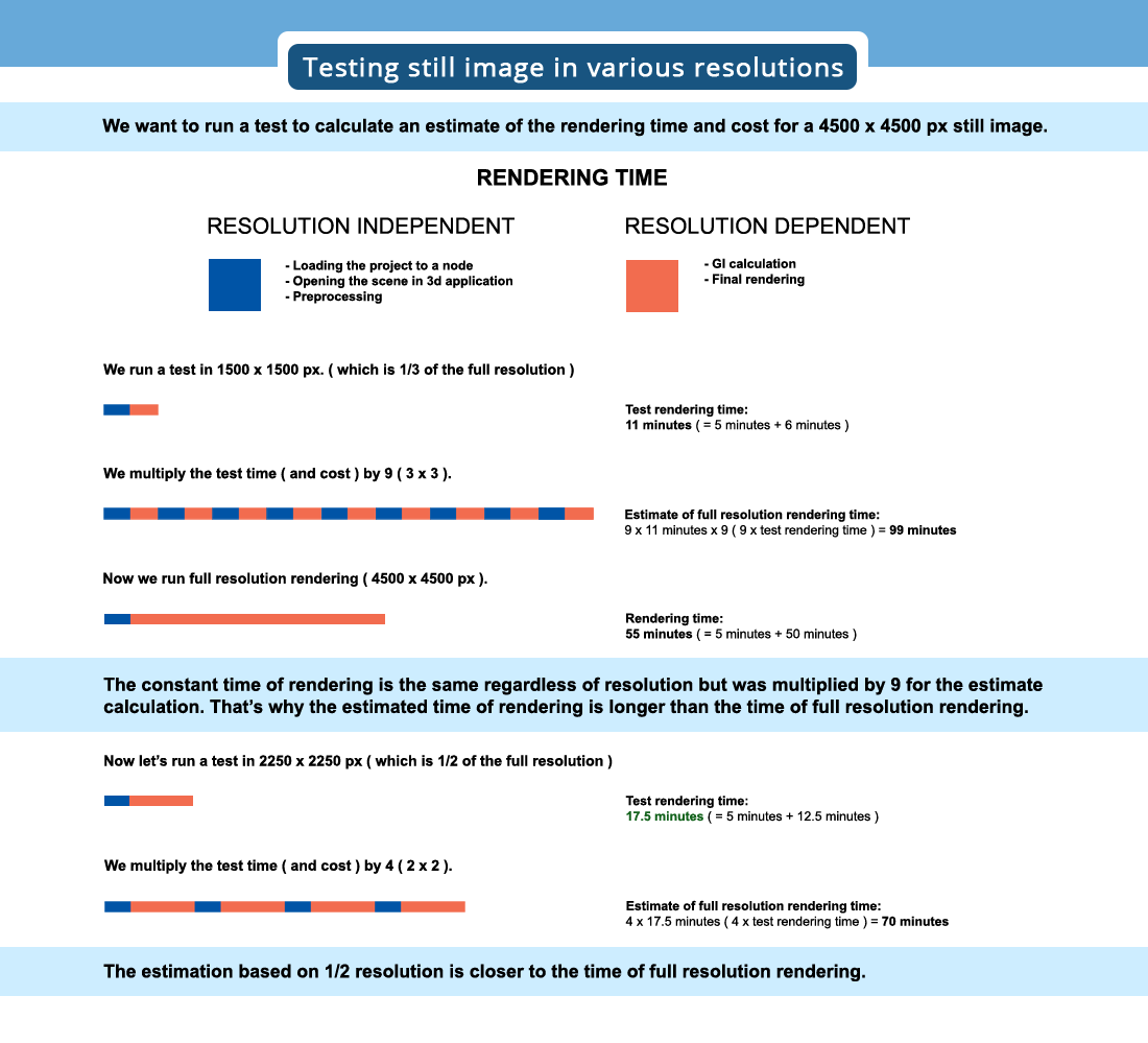 고해상도 렌더링 전 4분의 1 혹은 5분의 1의 저해상도로 렌더링하는 것입니다. 경우에 따라 저해상도 테스트렌더링은 최종렌더링에 걸리는 시간, 비용보다 낮은 비용이 나올 수도, 높은비용이 나올수도 있습니다. 렌더팜에 따라 다르지만 저희의 경우 낮은 비용이 나올 가능성이 더 높았습니다. 왜냐하면 렌더링 시간은 해상도에 따라서 더욱 빠르게 처리되고는 하기 때문입니다. 예를 들어,