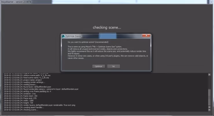 씬파일을 옵티마이즈 할 것인지를 묻는 창이 뜹니다.(저희 같은경우는 그랬습니다.) 그럼 옵티마이즈 버튼을 누릅니다.(옵티마이즈를 해주는것이 좋지만! 리깅 이라던지, maya에서 사용했던 플러그인에 문제가 생길 수도 있으니 확인후 해주시는 것이 좋을 것 같습니다!)