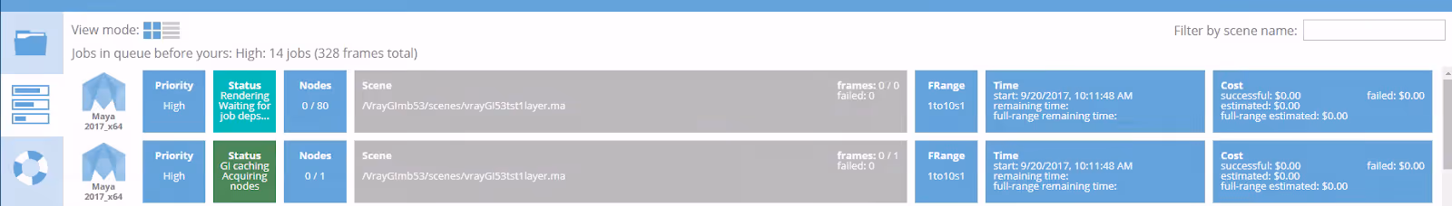 이렇게 작업이 진행됩니다! 한 씬파일 당 2개의 작업이 진행되는데, 하나는 gi caching 이고 gi caching이 끝나면 자동으로 본 랜더가 진행됩니다. 랜더가 완료된 이미지 파일들은 자동으로 프로젝트 폴더에 다운로드 됩니다!