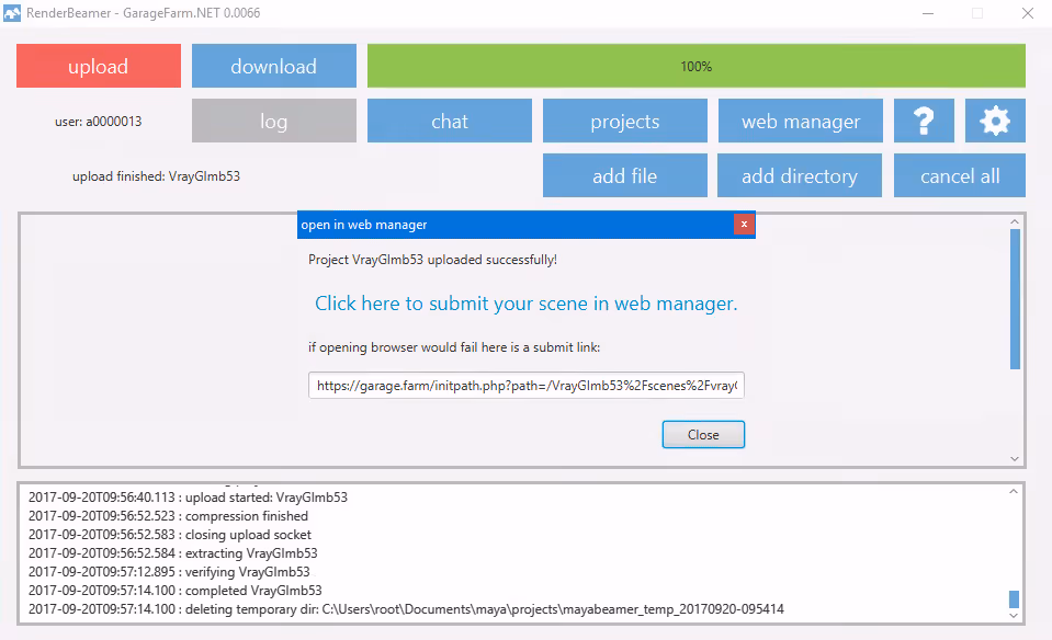 다 보내진 씬파일을 renderbeamer에서 web으로 업로드 합니다. 업로드가 100% 완료되면 web manager로 보내는 링크가 나오고, 저 링크를 누르면 garagefarm.net 웹페이지가 열립니다.