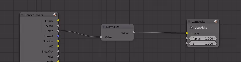 볼륨 분산을 사용하면 모든 곳에 작은 아티팩트가 생길 수 있으므로 주의하십시오. 그래서 저는 샘플 1개에서 깨끗한 Z 패스를 빠르게 렌더링 하였습니다. 이것은 여러분에게 흥미로운 트릭이될 수 있습니다. Z depth, 색상 확산 혹은 마스크와 같은 일부 패스의 경우 샘플 1개만 사용해도 완벽하게 깨끗한 결과를 얻을 수 있습니다.저는 안개를 설정해야 하므로 안개 패스보다 Z depth를 선호합니다. Z 패스가 작동하도록 하려면 편집기에서 정규화 노드를 사용해야만 합니다.