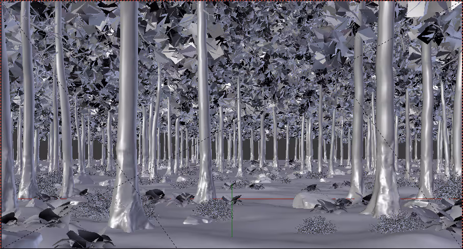 모든 나무는 인스턴스화 되고 카메라에 가장 가까운 나무는 손으로 배치하거나 가장 멀리 있는 나무는 입자 시스템을 사용하여 분산시킵니다.