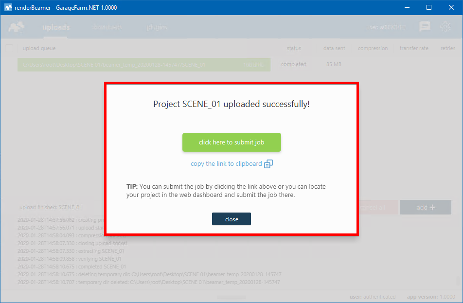 씬이 완전히 업로드 되면 어플리케이션이 웹매니저에서 온라인으로 씬을 제출할 수 있는 링크를 생성합니다. 어떤 이유로든 링크를 사용하여 창을 닫았거나 작동하지 않는 경우 웹 대시보드에서 프로젝트를 찾은 후 씬 파일을 클릭하여 씬을 제출할 수 있습니다.