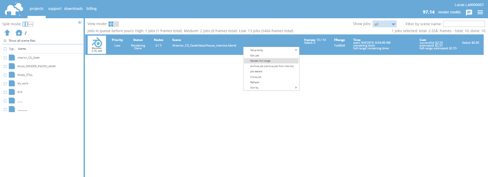 각 프레임은 완료되면 자동으로 다운로드 됩니다. 프레임을 즉시 다운로드하려면 렌더 작업 때마다 렌더비머 앱을 계속 실행해야 합니다. 프레임을 확인하고 맞다면 렌더링된 작업을 마우스 오른쪽 버튼으로 클릭하고 '전체 범위 렌더링'을 선택하여 웹매니저에서 전체 범위 작업을 제출할 수 있습니다. 시스템은 이미 렌더링 된 프레임을 건너뛰고 나머지 범위를 렌더링합니다. 또한 테스트로 렌더링한 몇 개의 프레임을 기준으로 전체 범위 작업에 대한 예상 비용을 볼 수 있습니다.